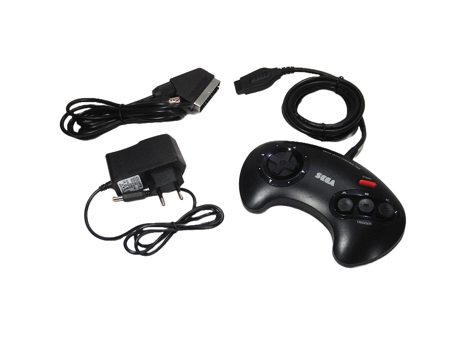 Megadrive II avec 1 Pad, Alimentation Secteur 220V, et Câble Vidéo RGB Déparasité + C-Sync.