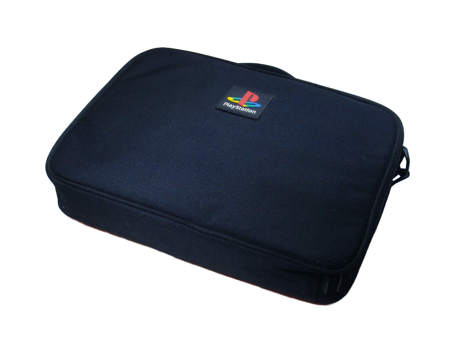 Sacoche PS1 d'occasion Semi Rigide Rectangulaire Noire avec Logo Officiel Playstation équipée d'une Lanière pour transporter votre Console en Bandoulière, ou à la main via la poignée.
